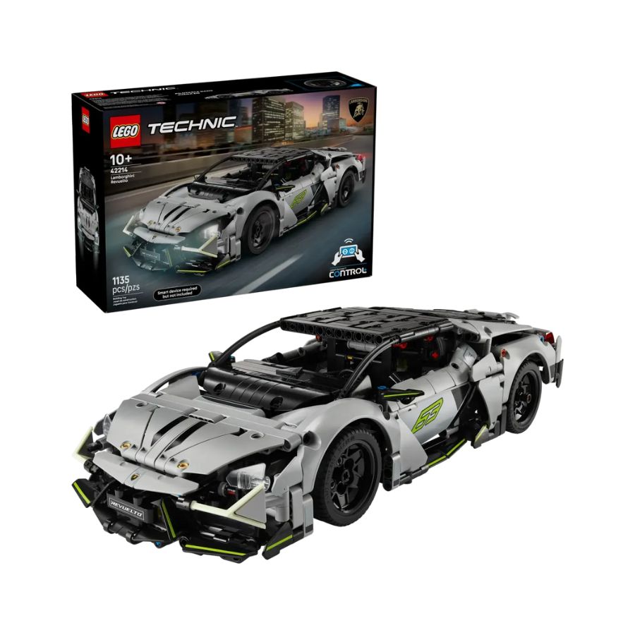 LEGO Technic 42214 is an accurate model of the Lamborghini Revuelto Super Sports Car, combining bold design with advanced engineering. The set includes 1,135 pieces and features a V12 engine with moving pistons, front and rear suspension, functional steering, and gullwing doors. It also includes glow-in-the-dark headlights, adding realism to the model. The car can be controlled using the CONTROL+ app, allowing drivers to steer, activate lights, and monitor live data from the app's screen. The distinctive gray and black colors give it a sleek sporty appearance. This set is suitable for children aged 10 and above and makes a perfect addition to any LEGO collection or for fans of supercars.