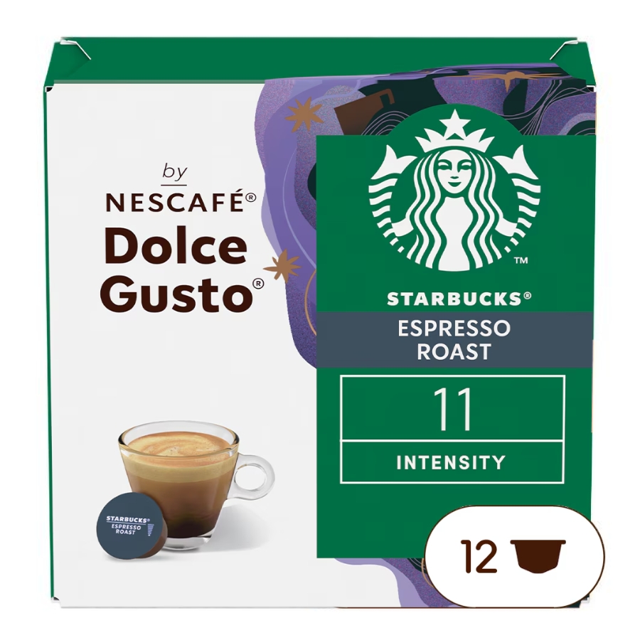 Nescafé Dolce Gusto Starbucks Espresso Roast Coffee Capsules offer a bold and richly roasted espresso experience, made to deliver strong flavour with notes of caramel and a robust body. Using 100% Arabica beans sourced from Latin America, this espresso roast is dark roasted to bring a full intensity, ideal for those who prefer their espresso with strength and character. Each capsule produces a small espresso-sized serving (Espresso 30 ml). The flavour profile features toasted caramel sweetness, soft spice and a deep roast aroma, with high intensity that holds up well even when paired with milk. Perfect for lovers of classic espresso who want that Starbucks flavour in a single-capsule format.