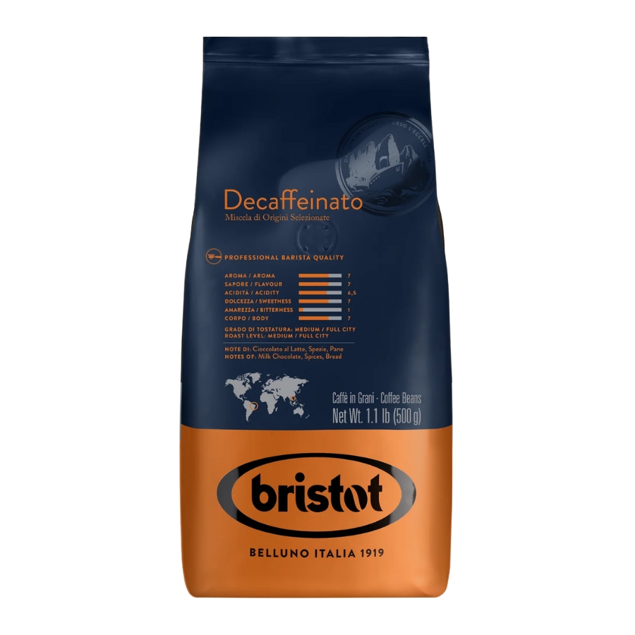 Bristot Decaffeinato Coffee Beans are specially crafted for those who love the rich taste and aroma of Italian espresso without the caffeine. This decaffeinated blend combines carefully selected Arabica and Robusta beans to deliver a smooth, full-bodied flavor with a velvety crema and subtle lingering notes. Each cup reveals delicate hints of chocolate, toasted nuts, and mild spices, offering a refined yet approachable taste suitable for espresso, cappuccino, or latte. Bristot Decaffeinato ensures that coffee enthusiasts can enjoy the authentic Italian espresso experience at any time of the day, maintaining the quality, aroma, and richness of Bristot’s premium blends while being caffeine-free.