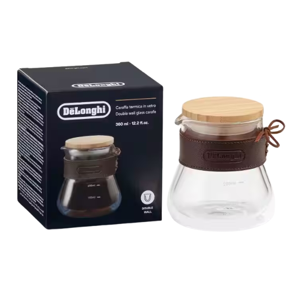 The De'Longhi Double Wall Glass Carafe is a 360 ml thermal coffee accessory crafted from hand-blown borosilicate glass with a double-wall design that helps keep your coffee or other hot drinks warm for longer while the outer surface stays cool and condensation-free to hold comfortably. It includes a bamboo lid with a silicone gasket to lock in heat and freshness, a dedicated pour spout for smooth serving, and a stylish simil-leather band with an engraved De’Longhi logo for grip and aesthetic appeal. The carafe is designed to fit comfortably under your coffee machine’s drip tray and is microwave- and dishwasher-safe (except for the lid and leather band), making it a practical and elegant addition to your home coffee setup.