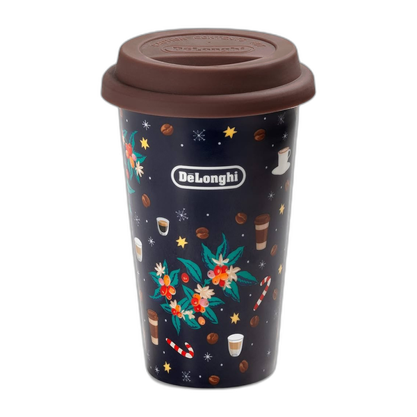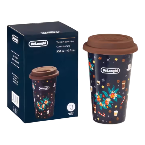 The De'Longhi Ceramic Mug is a handmade double-walled ceramic coffee mug (about 300 ml) designed to keep your drink at the ideal temperature longer thanks to its thermal-insulating double-wall construction, while the silicone lid helps maintain freshness and prevent spills. It’s microwave and dishwasher safe, making it practical for daily use with espresso, cappuccino, latte or tea, and often features attractive, decorative designs that suit home or office settings.