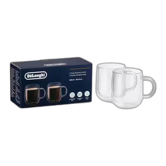 The De'Longhi 2 Double Wall Glass Mugs are a set of two premium insulated glass cups crafted from double-walled borosilicate glass to help keep your beverages hot (or cold) longer while the exterior stays comfortable to hold. Their thermal construction reduces condensation and showcases drinks beautifully with a “floating” effect, making them ideal for coffee, lattes, tea or iced drinks. These mugs are dishwasher-safe and combine elegant design with everyday practicality, perfect for enhancing your coffee or drink presentation at home.