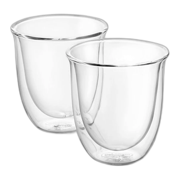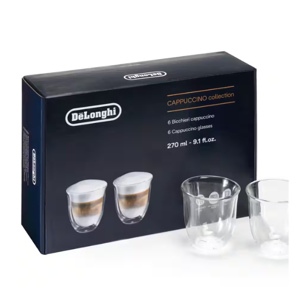 The De'Longhi 6 Cappuccino Glasses are a premium set of six double‑walled thermal glasses crafted from mouth‑blown borosilicate glass that keeps your cappuccino warm longer while the outer surface stays cool to the touch. Each glass has a generous ~270 ml capacity, ideal for classic cappuccino servings, and the double‑wall construction prevents condensation and provides comfortable handling. Dishwasher‑safe and elegant in clear glass, this set enhances both everyday coffee rituals and special occasions — perfect for serving guests or gifting to coffee lovers.