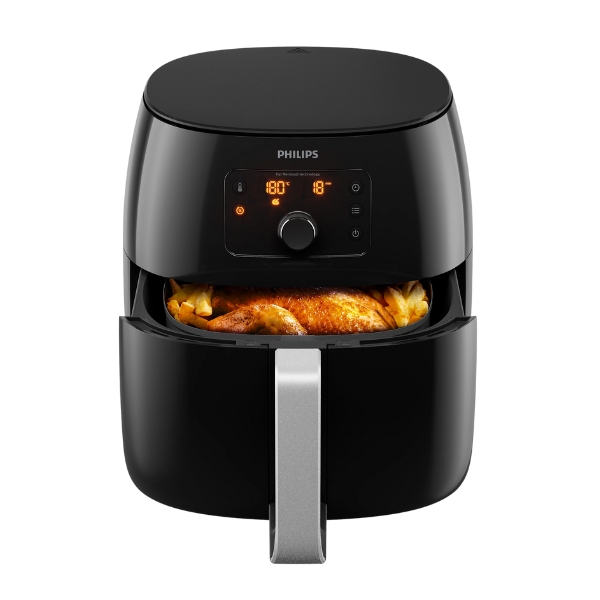 The Philips Premium Airfryer XXL HD9650/91 is a large-capacity air fryer designed for healthier cooking, capable of frying with up to 90% less fat thanks to its Fat Removal Technology. It offers a 1.4-kg basket (approx. 7.3-litre capacity) suitable for whole chickens or large family meals, and includes a Keep-Warm mode that maintains food temperature for up to 30 minutes. Equipped with RapidAir technology, it uses faster airflow to deliver food that’s crispy on the outside and tender inside. The cooker has 5 preset cooking programs, a digital interface with QuickControl dial to set temperature between 40-200 °C and timer up to 60 minutes. Cleaning is easier thanks to a QuickClean non-stick basket and all removable parts being dishwasher-safe. It also features a cool-wall exterior, automatic shut-off, and a sleek black finish with a digital display.