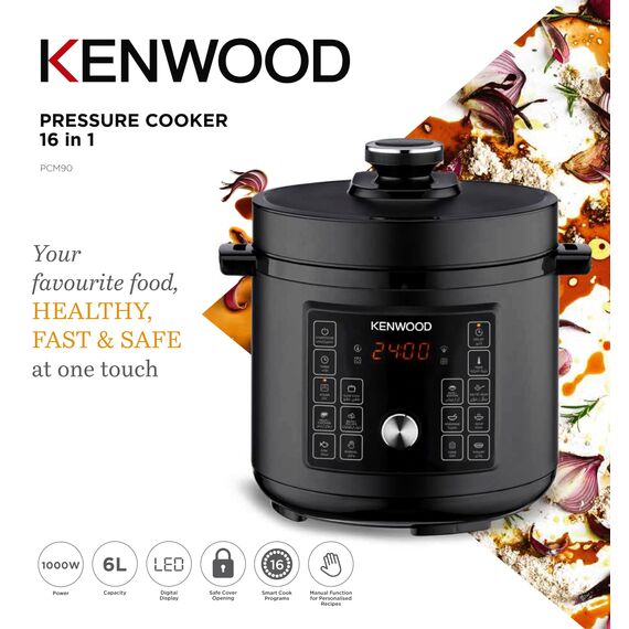 The Kenwood PCM90 is a 6-liter multi-function electric pressure cooker designed to simplify home cooking. It offers 16 cooking programs including pressure cook, slow cook, rice, steam, sauté, soup, cake, yogurt, and more. With a 1000 W heating element, it provides fast and efficient cooking performance. The unit includes a keep warm function that maintains food temperature after cooking. The cover includes a removable exhaust valve for safer opening. Its intuitive LED display, along with adjustable pressure and timer settings, gives users control and flexibility.