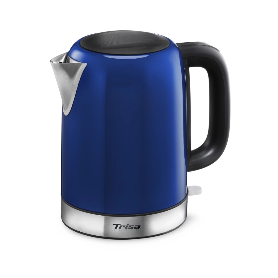 The Trisa “Diners Edition” Blue 1.7L electric kettle combines style and functionality. It features a high-quality stainless steel body with a sleek blue finish. The kettle offers a capacity of 1.7 liters and includes a removable and washable filter. Safety features include an automatic shut-off with Strix control and LED lighting. The lid opens with the push of a button, and the base allows for 360° rotation with cord storage. It is protected against overheating and dry running.