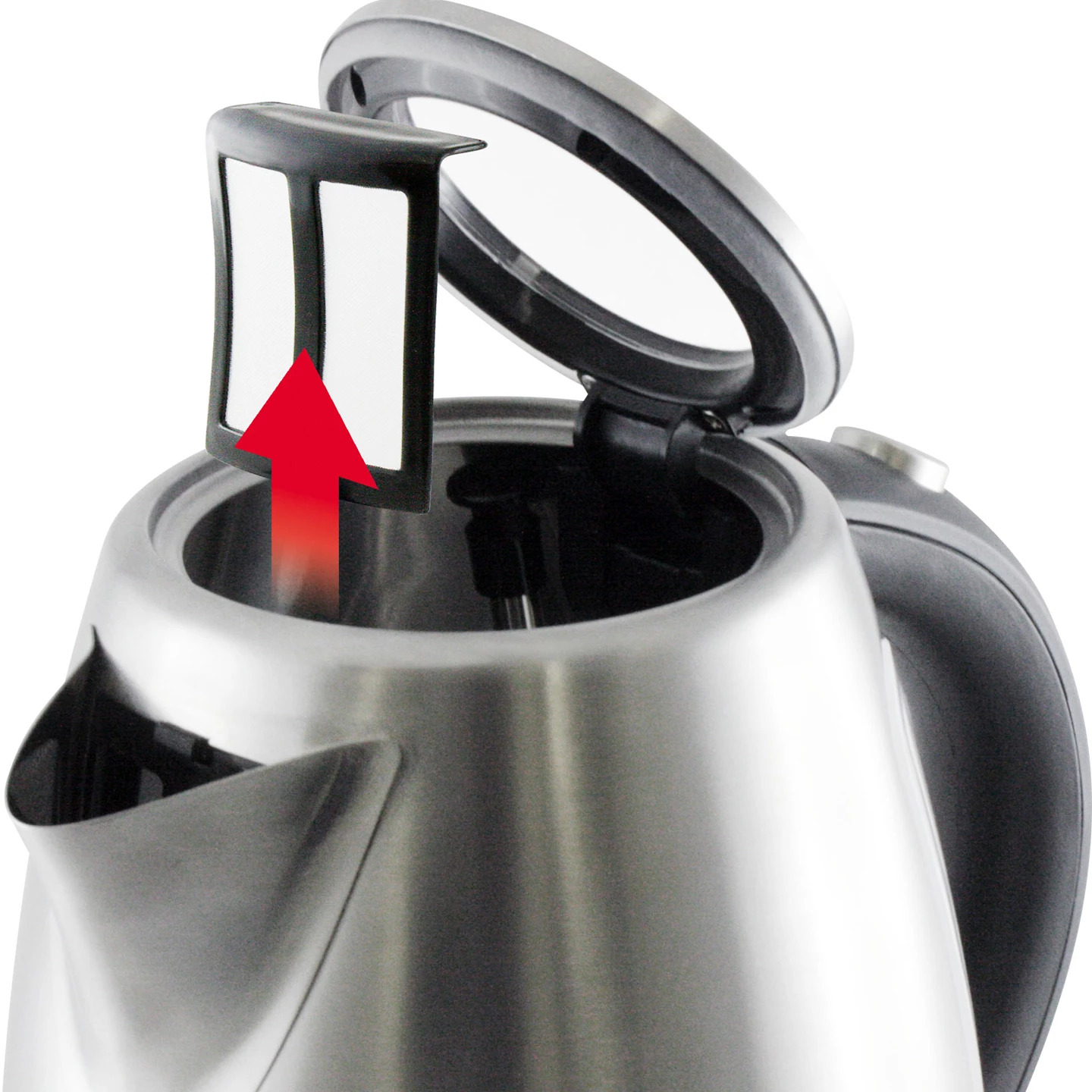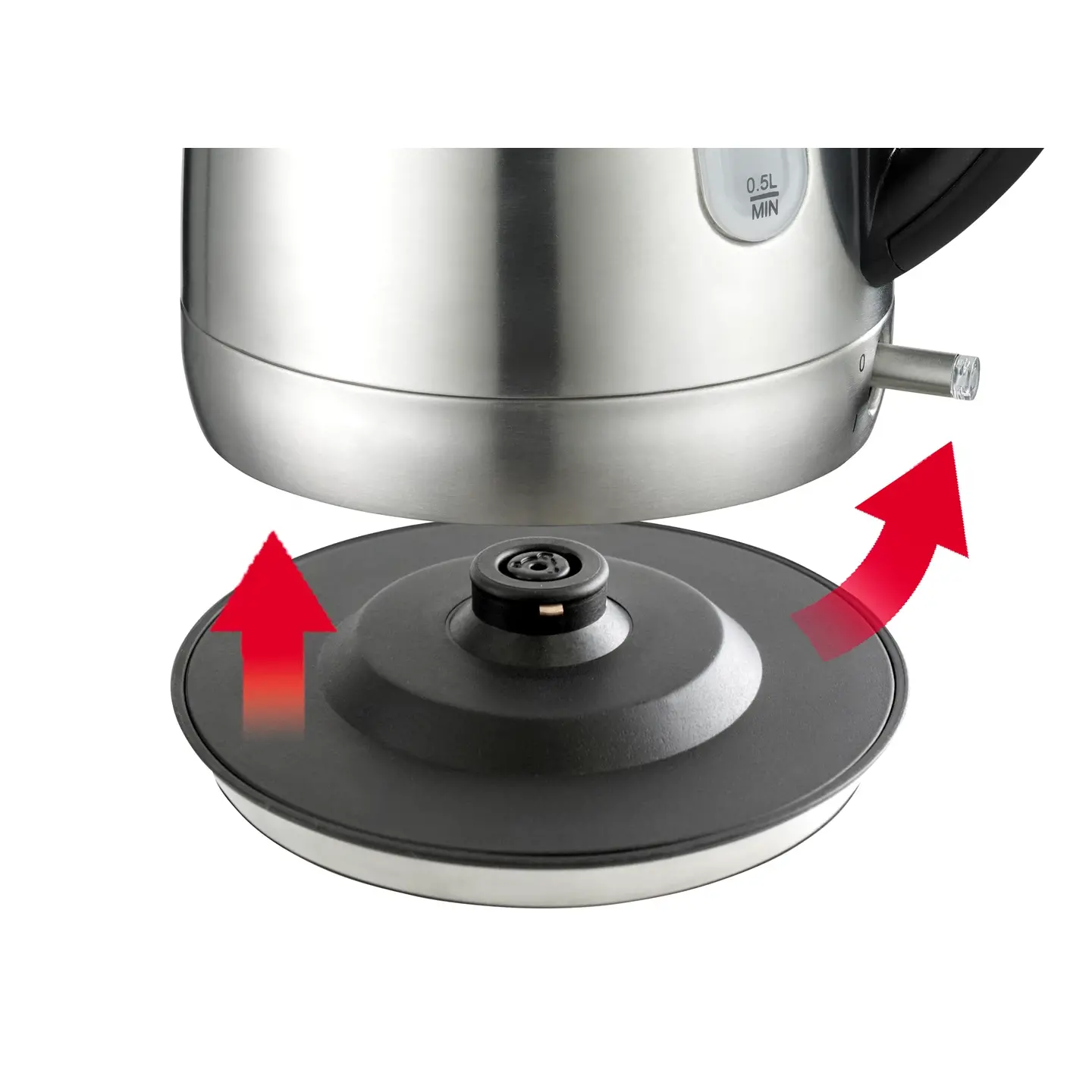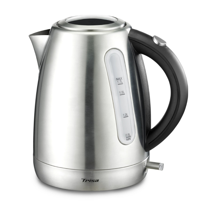 The Trisa “Compact Boil” W4875 is a 1.7L electric kettle designed for efficiency and safety. It features a powerful 2200W heating element for rapid boiling and a high-quality stainless steel body. The kettle includes a removable and washable filter, automatic shut-off with Strix control, LED indicator, and a 360° swivel base with cord storage for convenience. The lid opens at the touch of a button, and the kettle is protected against overheating and dry running.