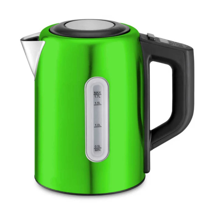 The Trisa “Vario Temp” Green 1.7L electric kettle offers precise temperature control for various beverages. It features a high-quality stainless steel body with a sleek green finish. The kettle provides a capacity of 1.7 liters and includes a removable and washable filter. Safety features include an automatic shut-off with Strix control and LED lighting. The lid opens with the push of a button, and the base allows for 360° rotation with cord storage. It is protected against overheating and dry running.