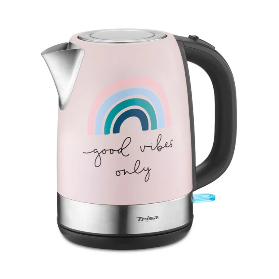 The Trisa “Good Vibes Only” 1.7L electric kettle combines modern design with practical features. It boasts a brushed stainless steel body adorned with a motivational rainbow print, adding a cheerful touch to your kitchen. The kettle offers a capacity of 1.7 liters and includes a removable and washable anti-limescale filter. Safety features include an automatic shut-off with Strix control and LED lighting. The lid opens with the push of a button, and the base allows for 360° rotation with cord storage. It is protected against overheating and dry running.