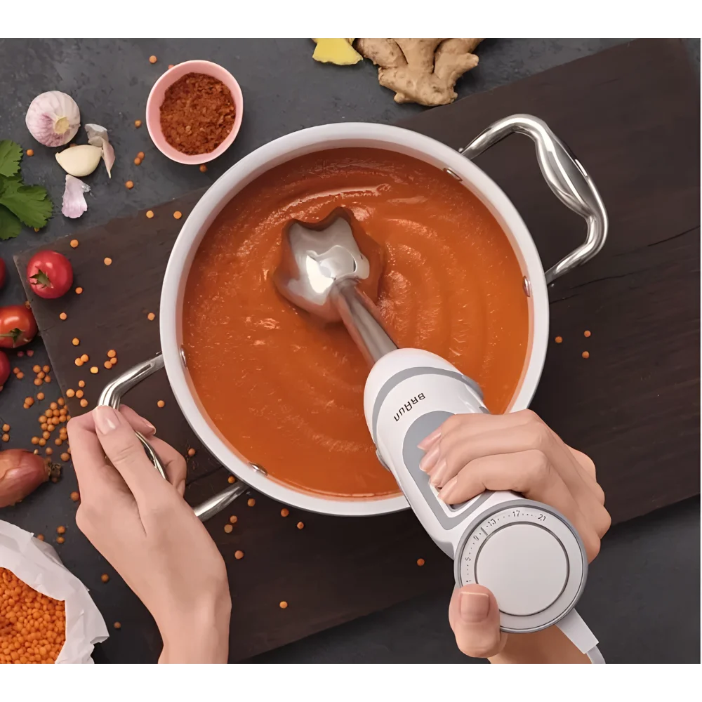 The Braun MultiQuick 5 Vario Hand Blender MQ5245 offers precision, power, and control for perfect blending results every time. With 21 variable speed settings and PowerBell Plus technology, it ensures smooth, even blending for soups, sauces, smoothies, and more. The Turbo function provides an extra burst of power for tougher ingredients, while the ergonomic handle ensures comfortable, one-hand operation. Easy to clean with detachable, dishwasher-safe parts, the Braun MQ5245 combines German engineering with everyday practicality, making it an essential kitchen tool for effortless cooking.