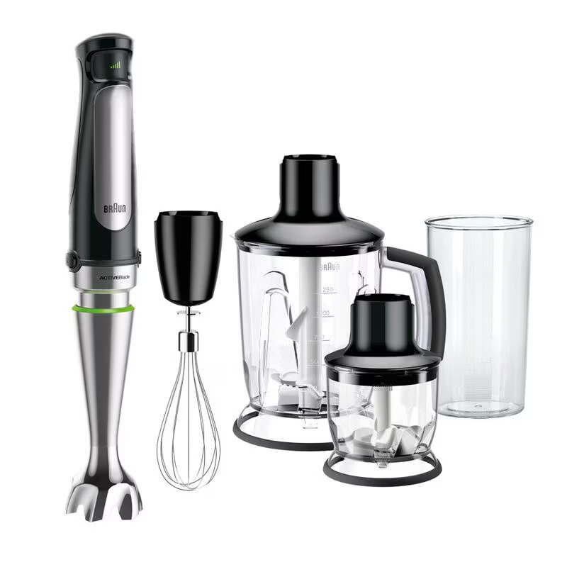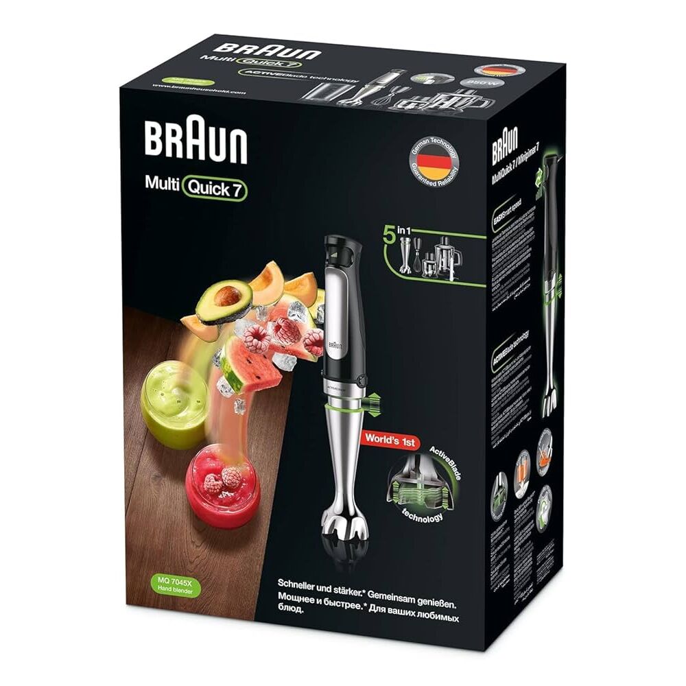 The Braun MultiQuick 7 Hand Blender MQ7045X is a powerful and versatile kitchen tool designed for blending, pureeing, and chopping with ease. Featuring PowerBell Plus technology and ultra-sharp stainless steel blades, it delivers smooth and consistent results even with tough ingredients. The variable speed control allows precise adjustments for soups, sauces, smoothies, and more. Lightweight and ergonomically designed, it provides comfortable handling during extended use. Detachable shaft and accessories make cleaning quick and simple, making the Braun MultiQuick 7 MQ7045X ideal for everyday kitchen use and professional-quality meal preparation.