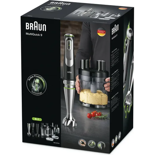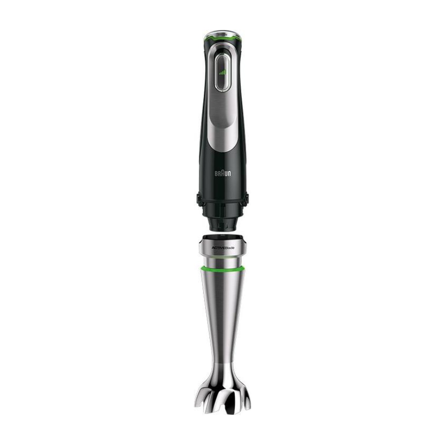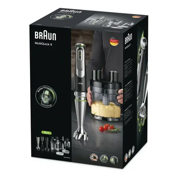 The Braun MultiQuick 9 Hand Blender MQ9187 represents the ultimate blending performance and innovation in your kitchen. Featuring ACTIVEBlade Technology, the blade moves up and down to blend even the toughest ingredients with ease, reducing effort while increasing efficiency. The 1200W motor provides powerful, consistent performance, while the SmartSpeed control allows you to adjust the blending speed intuitively with a gentle squeeze. The MQ9187 includes versatile attachments such as a chopper, whisk, puree accessory, and beaker, making it ideal for soups, sauces, smoothies, and more. Built with PowerBell Plus and SplashControl technology, it ensures smooth, splash-free blending every time. The BPA-free, dishwasher-safe parts and ergonomic handle make this model both powerful and practical — a true all-in-one kitchen solution.