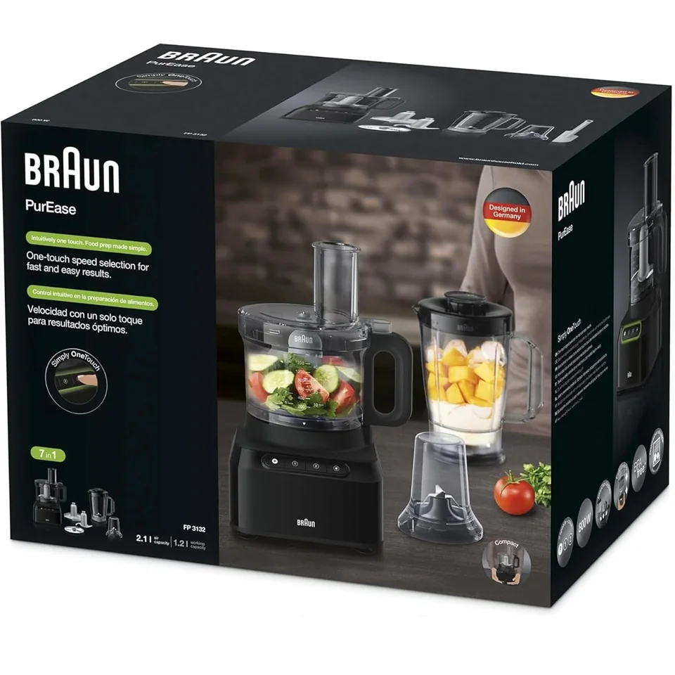 The Braun PurEase Black Food Processor FP301AI is designed to make everyday meal preparation fast, simple, and efficient. With its compact design and powerful motor, it easily handles chopping, slicing, shredding, kneading, and mixing tasks. The dual-speed control with pulse function ensures precision for different ingredients, while the large bowl capacity lets you prepare bigger portions effortlessly. All parts that come in contact with food are BPA-free and dishwasher-safe, making cleaning quick and easy. Stylish, durable, and versatile, the FP301AI helps you create delicious homemade meals with minimal effort.