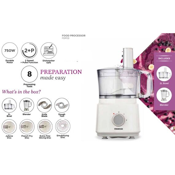 The Kenwood FDP03 Food Processor is the perfect choice for effortlessly preparing a variety of dishes. With its powerful 750W motor, it delivers excellent performance in chopping, grating, blending, and kneading tasks. It features a 2L bowl and a 1.8L blender, allowing for the preparation of large quantities of food. Included are 3 interchangeable slicing discs, including a slicing, grating, and dough disc, to cater to various cooking needs. Its sleek white design adds an elegant touch to your kitchen.