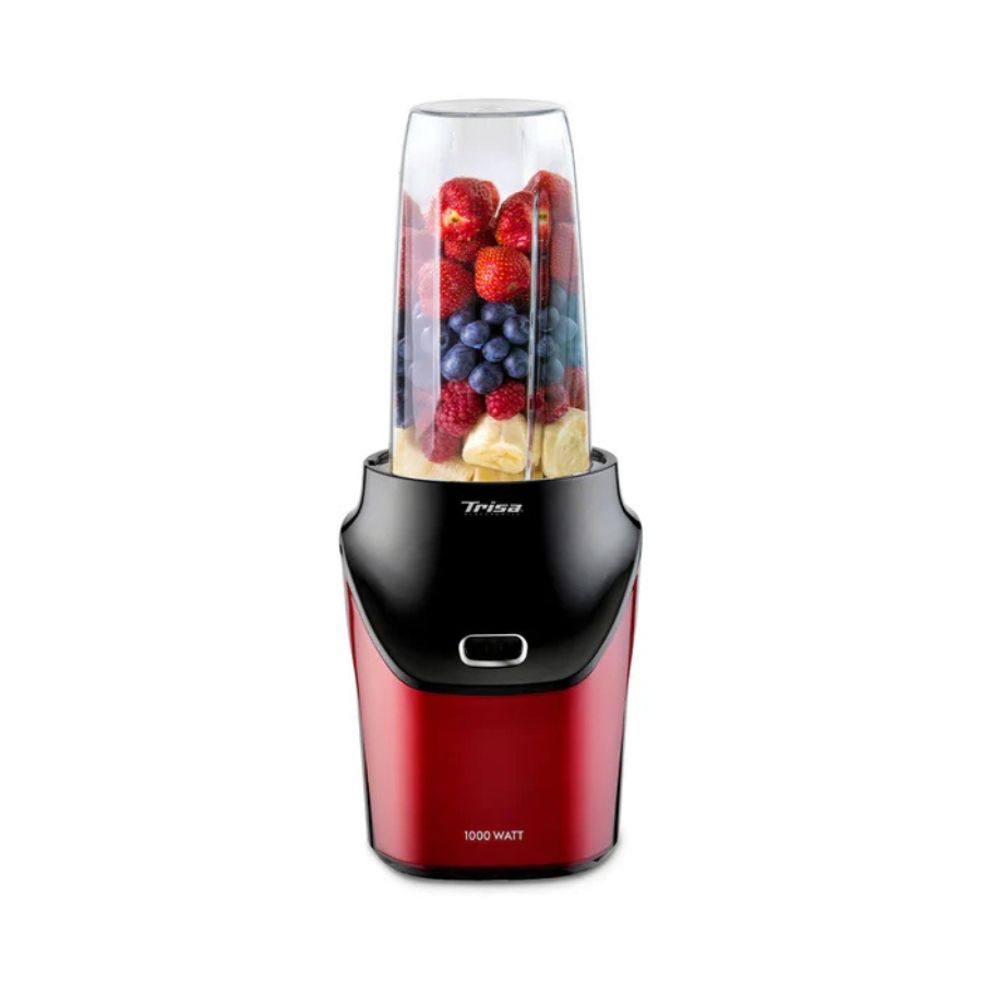 The Trisa Nutri Blender “Energy Boost” in red is a compact and powerful personal blender designed for quick and efficient blending. It features a 600 W motor and operates at speeds up to 22,000 RPM, making it ideal for preparing smoothies, shakes, and purees. The blender comes with a 600 ml BPA-free Tritan bottle, perfect for on-the-go use. Its compact design ensures easy storage, and all removable parts are dishwasher safe for convenient cleaning.