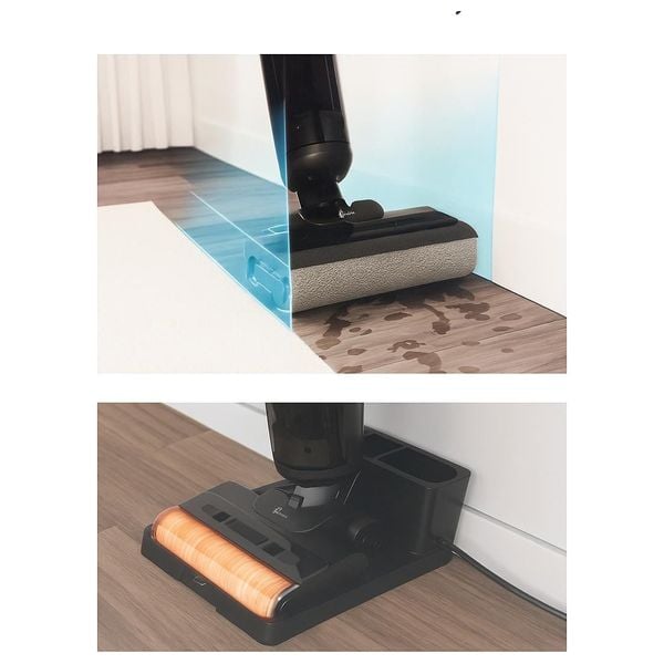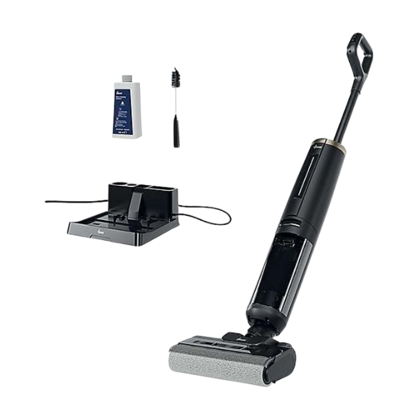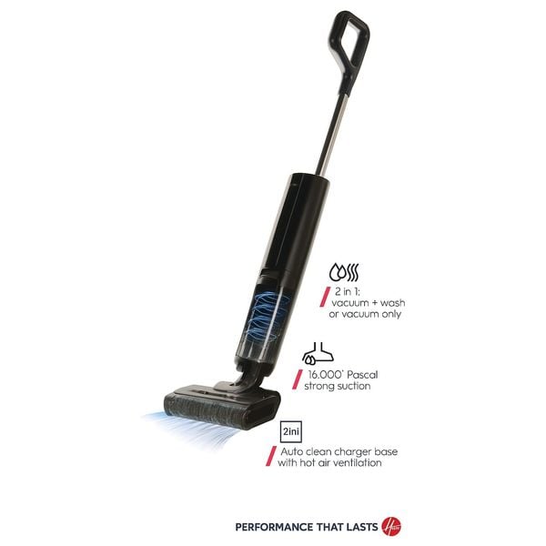 Hoover Cordless Vacuum delivers powerful cleaning with a 220 W motor and a 21.6 V battery. It features dual 0.55 L tanks for dry debris and wet cleaning, up to 40 minutes of runtime, and a 4.5-hour recharge. Choose between vacuum-only or vacuum-plus-wash modes, plus Turbo Boost, a smart voice assistant, hair-tangle prevention, and an auto-cleaning base that cleans and dries the roller after use. Includes a charging dock and attachments.