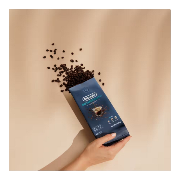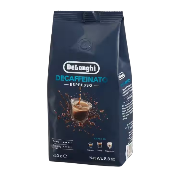 The De'Longhi Decaffeinato Espresso is a 250 g bag of premium decaffeinated coffee beans crafted for rich flavour without the caffeine kick. It’s a balanced medium roast blend of 50 % Arabica and 50 % Robusta beans, decaffeinated naturally using CO₂ to preserve aroma and taste while removing caffeine. The result is a pleasant, full-bodied profile with delicate acidity and notes of cocoa, caramel, biscuits, nuts and chocolate, along with a strong, spicy aroma — ideal for preparing espresso, cappuccino or other coffee styles with good crema and flavour depth. With an intensity rating around 5, it offers satisfying complexity without the buzz, suitable for anytime enjoyment.