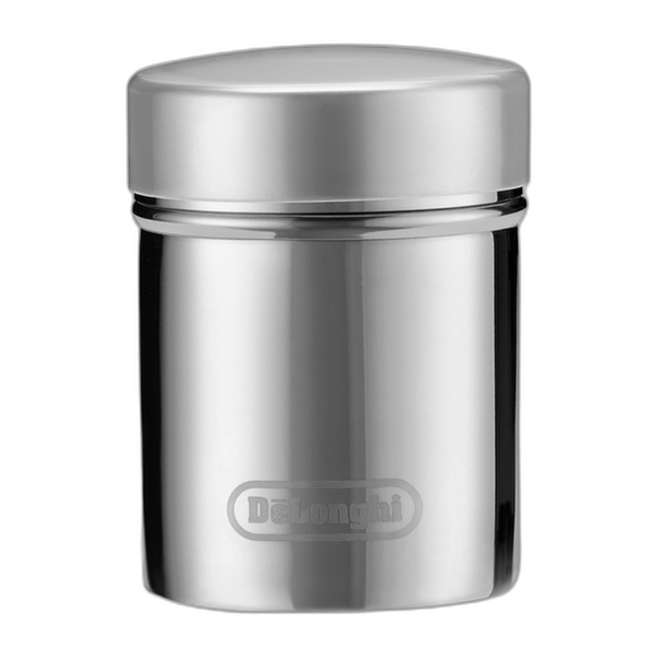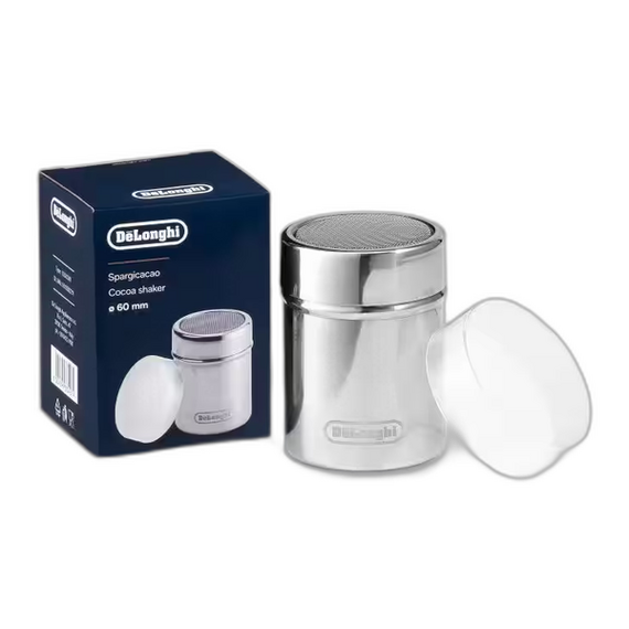 The De'Longhi Cocoa Shaker is a stainless-steel coffee accessory designed to help you finish your cappuccinos, lattes and hot chocolates with style. It features a fine mesh lid that lets you evenly sprinkle cocoa powder, cinnamon, powdered sugar, vanilla or other spices over your drinks for a café-quality touch, and a removable plastic cover keeps the contents fresh and dry when stored. The shaker has a polished brushed stainless-steel body with a 175 ml capacity and is dishwasher-safe for easy cleaning, making it a simple but stylish addition to your home coffee bar.