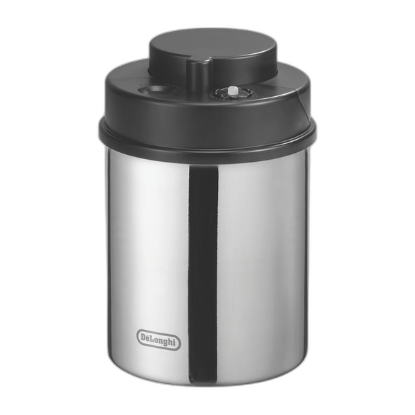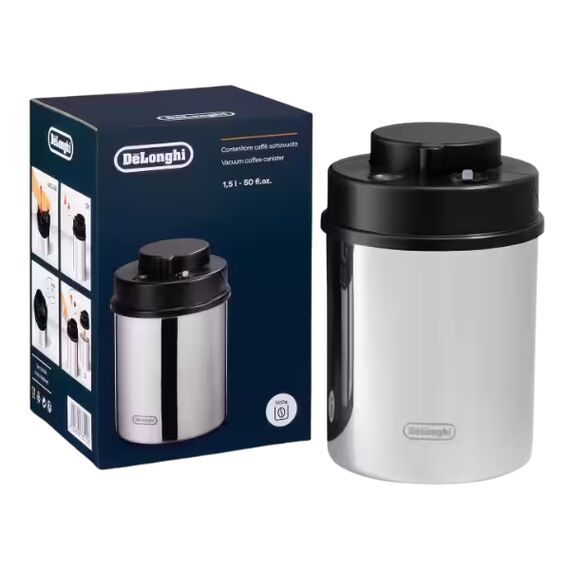 The De'Longhi Vacuum Coffee Canister is a specialized storage accessory designed to help keep your coffee beans or ground coffee fresher for longer by creating an airtight, vacuum-sealed environment that protects them from oxygen, moisture, pests and light. The press-type vacuum system is easy to use — simply press to seal and create a vacuum — and many models include a built-in date indicator so you can track freshness. With a polished stainless-steel body and durable construction, this canister preserves flavour and aroma for up to about 15 days, making it ideal for daily coffee drinkers who want rich, fresh coffee every time.