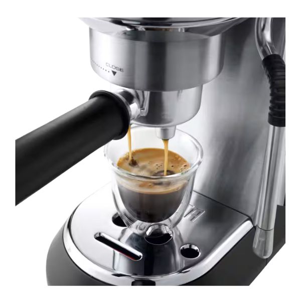 The De'Longhi Dedica Arte Coffee Machine is a compact manual espresso machine that brings barista-style coffee making into your kitchen with professional-level performance in a slim, stylish design. At only about 15 cm wide, it fits easily on crowded countertops while offering a 15 bar pressure pump and Thermoblock heating system for rich espresso with a thick, aromatic crema. It includes two filter baskets (for single and double shots), is compatible with both ground coffee and E.S.E. pods, and comes with a My LatteArt steam wand that lets you texture milk for cappuccinos and lattes, plus an adjustable drip tray for taller cups. Finished in sleek metal with intuitive controls and rapid heat-up, Dedica Arte delivers café-quality espresso and milk-based drinks at home with style and simplicity.