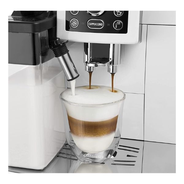 The De'Longhi Cappuccino Coffee Maker is a fully automatic bean-to-cup coffee machine that combines convenience and quality for everyday home brewing. It has a built-in conical grinder with 13 adjustable settings so you can tailor grind size for your taste, a 250 g bean hopper and a 1.8 L removable water tank for multiple drinks without frequent refills. With 15 bar pump pressure for rich extraction, it can brew espresso, coffee and cappuccino at the touch of a button, and features De’Longhi’s LatteCrema automatic milk system for creamy, long-lasting foam plus automatic milk cleaning. The intuitive text display with button controls lets you adjust coffee strength, volume and temperature, and helpful functions like automatic rinsing, descaling alerts, water filter support and energy-saving standby make it easy to maintain and use daily.