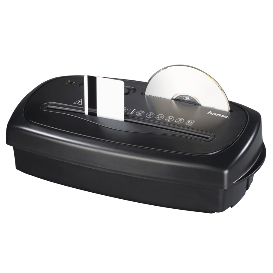 The Hama Home X10CD is a cross‑cut paper shredder that can destroy up to 10 sheets of A4 (80 g/m²) at once. It also supports shredding of CDs, DVDs, Blu-ray discs, and plastic cards through a separate slot. The cutters are made from high-quality steel and can handle staples. The shredder features an automatic start/stop function, a reverse mode to clear jams, and an overheat protection system. With a 15-liter waste bin and a separate container for disks, it's designed for secure and efficient disposal of sensitive documents.