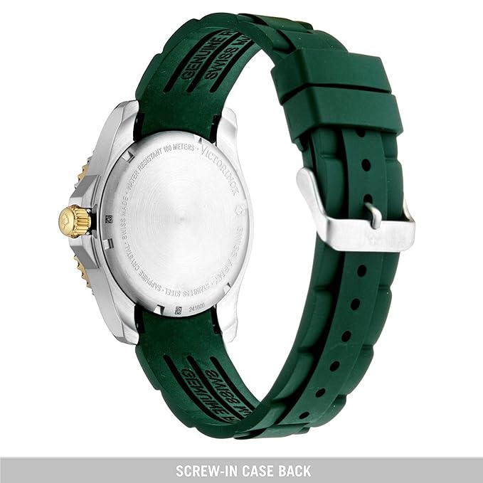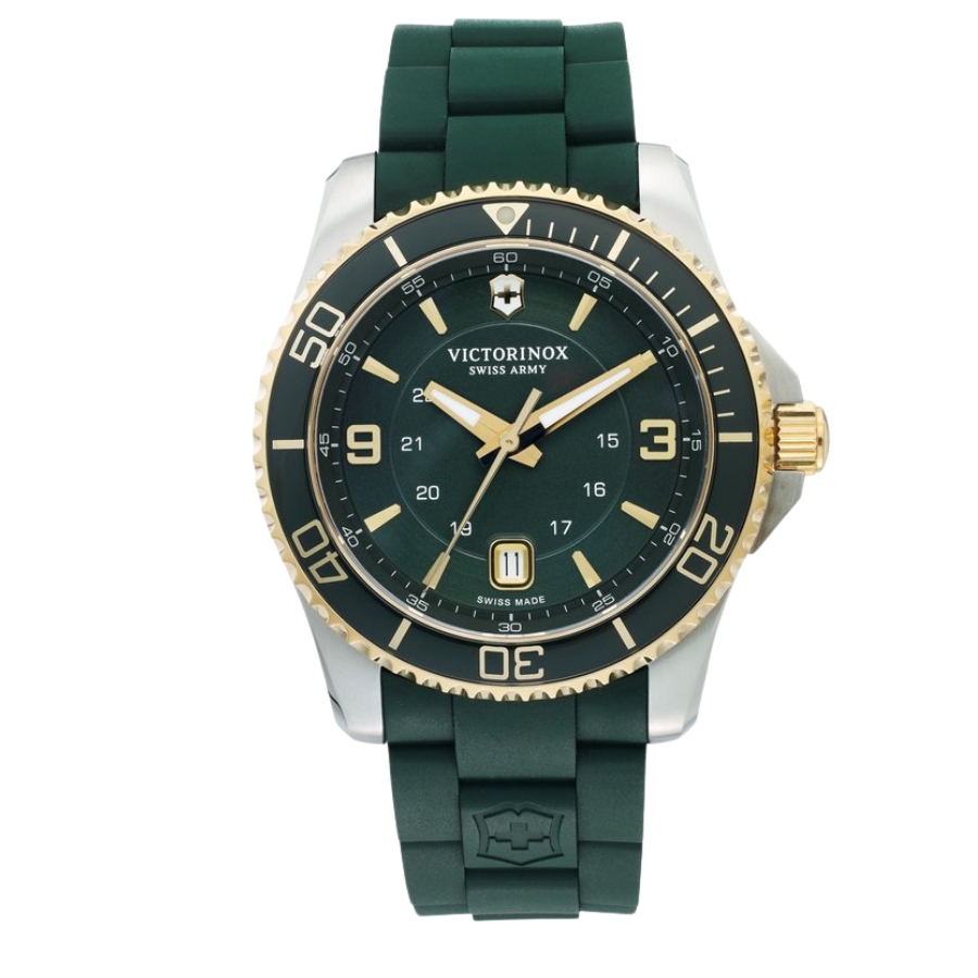 Victorinox Analog Green Dial Men’s Watch 43mm is a striking Swiss-made timepiece from Victorinox’s Maverick collection that blends rugged capability with refined everyday style. Featuring a 43 mm stainless steel case and bracelet, this analog quartz watch showcases a rich green dial protected by a scratch-resistant sapphire crystal, giving it both durability and clarity. The dial’s silver-tone hands and markers offer crisp legibility, while the date function adds practical convenience. Around the dial sits a unidirectional rotating bezel inspired by dive watches, and the watch is water-resistant up to 100 m — making it ready for swimming or everyday wear with confidence. Its Swiss precision quartz movement ensures reliable timekeeping, and the robust deployant clasp on the bracelet completes a comfortable yet secure fit, making this Victorinox watch a versatile choice for both active adventures and polished casual looks.